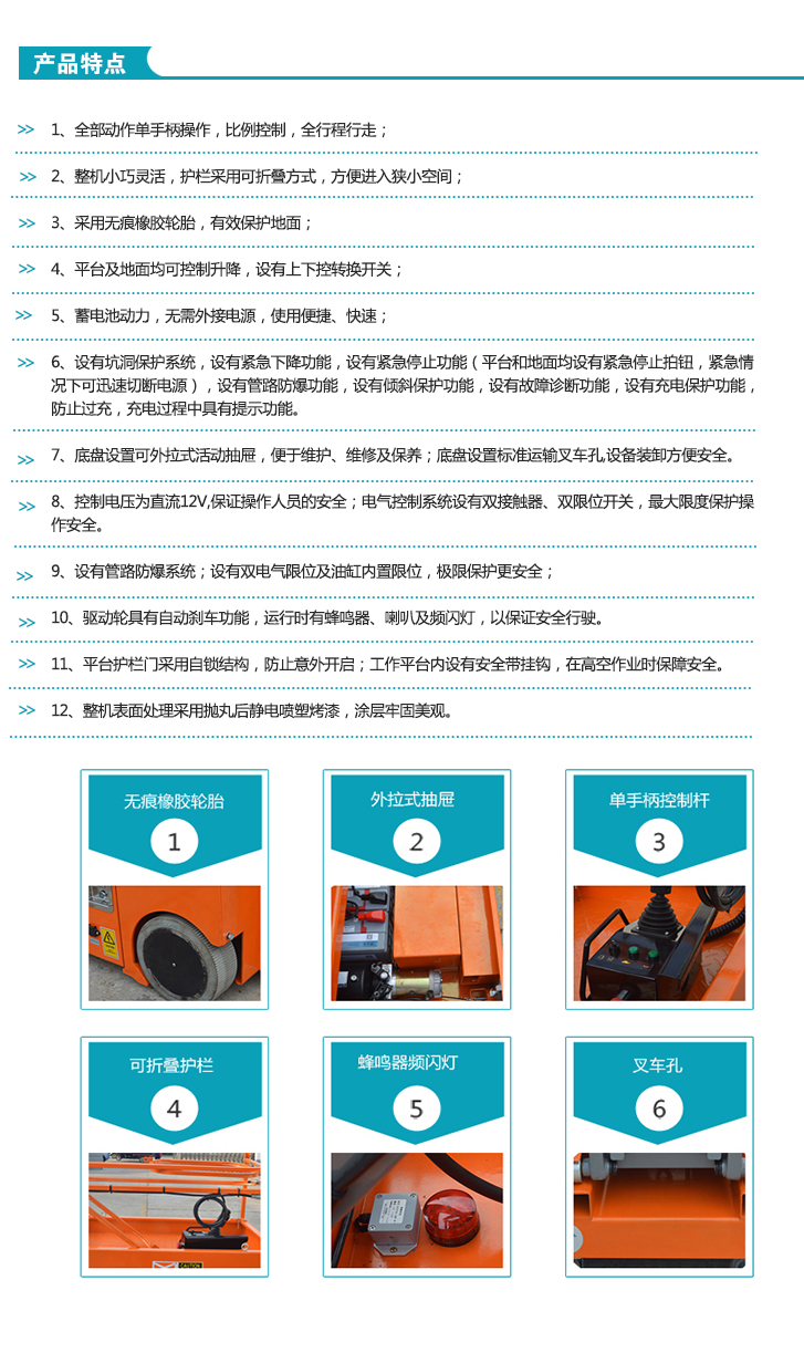 - 產品特點:體積小、自重輕、移動靈活,可通過狹小門洞或電梯,能在極小空間發揮最大作用。可代替傳統梯子或腳手架,提高工作效率,保障操作人員安全,是高空作業的必備工具。